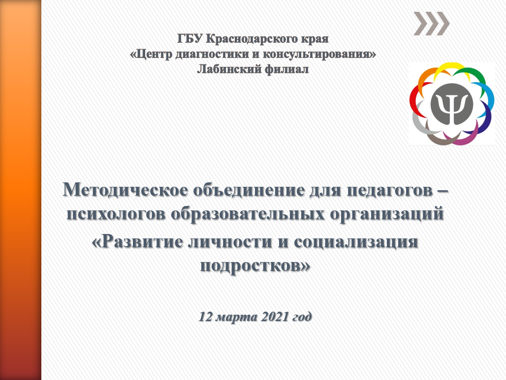 Мероприятия с 09.03.2021 года по 12.03.2021 года: Методическое объединение Новороссийский филиал Методическое объединение Лабинский филиал 12 марта 2021 года специалистами Лабинского филиала проведено методическое объединение для педагогов – психологов образовательных организаций на тему: « Развитие личности и социализация подростков». Методическое объединение Белоглинский филиал Мероприятия с 09.03.2021 года по 12.03.2021 года