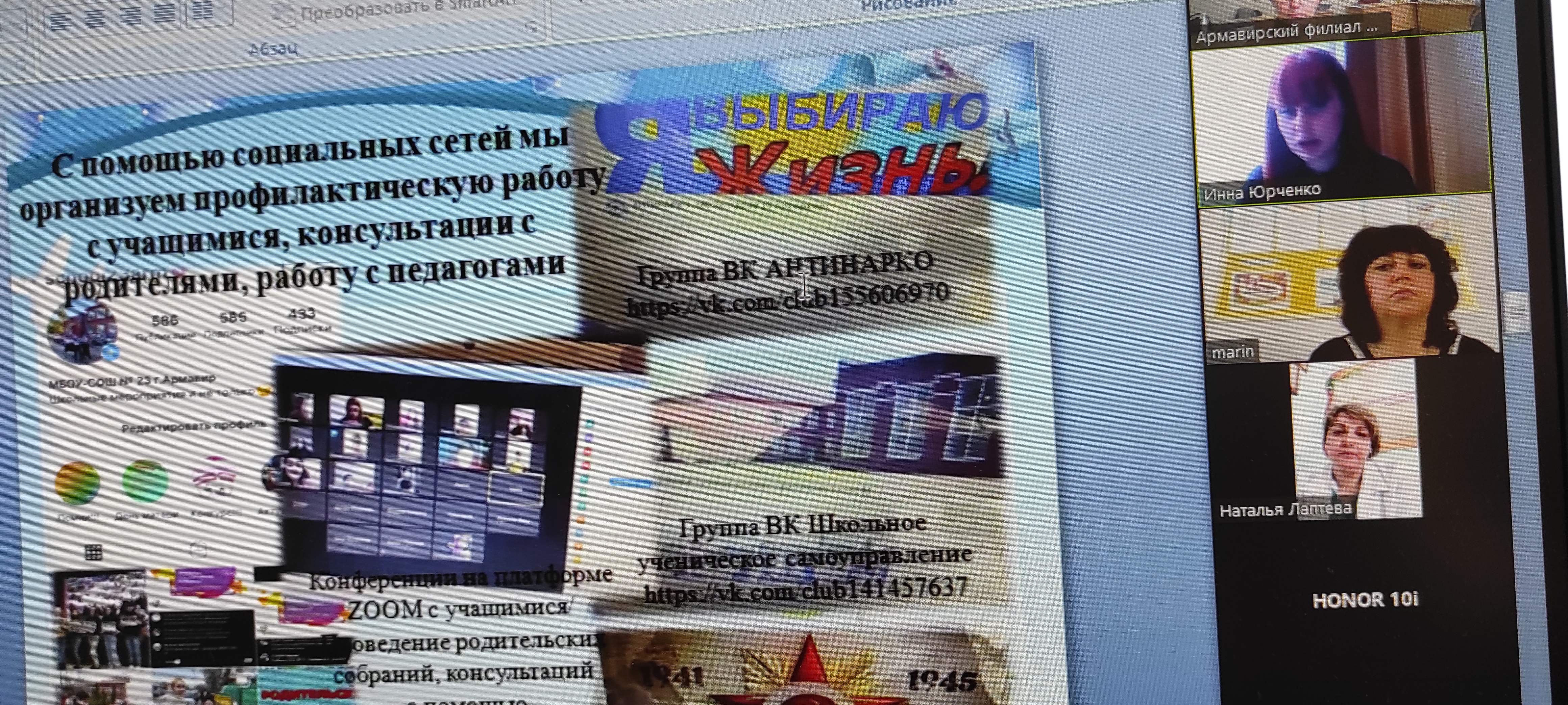 Педагоги-психологи Армавирского филиала Иващенко О.С., Вдовченко Н.Н. рассказали о особенностях деятельности педагога-психолога в условиях дистанционного образования. Юрченко Инна Юрьевна, педагог-психолог МБОУ-СОШ № 23 города Армавира выступила по теме: «Организация профилактической работы педагога-психолога в условиях дистанционной формы обучения. Использование в работе сетевых и дистанционных технологий». Королёва Наталья Павловна, педагог-психолог МБДОУ № 24 г. Армавира, рассказала о дистанционной работы с родителями и дошкольниками с использованием ИКТ. Сидорова Светлана Анатольевна, педагог-психолог МБДОУ № 25, выступила с темой «Дистанционные технологии в деятельности педагога-психолога в ДОУ».