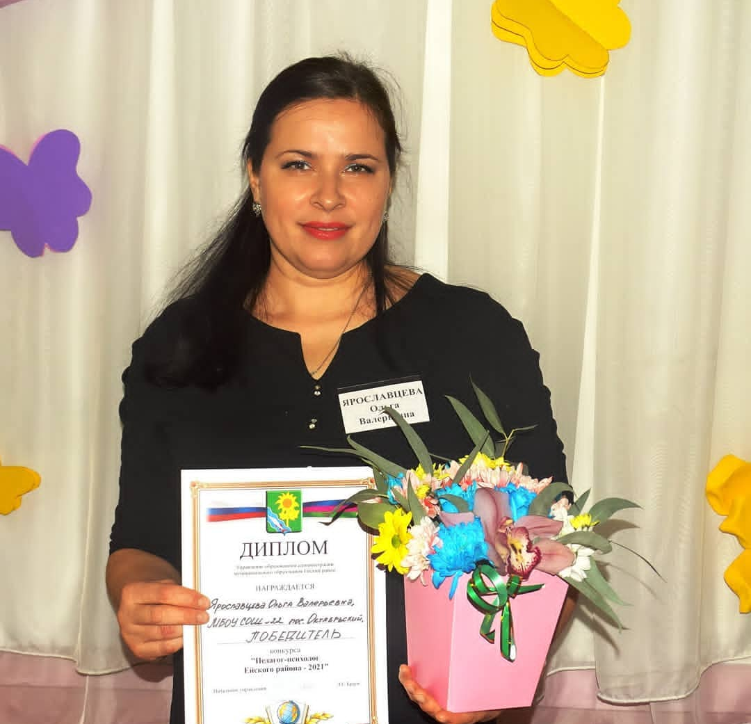 По итогам всех конкурсных испытаний победителем признана Ярославцева Ольга Валерьевна, педагог-психолог средней школы №22 п.Октябрьский, которая будет представлять Ейский район на краевом конкурсе «Педагог-психолог Кубани» в 2021 году.