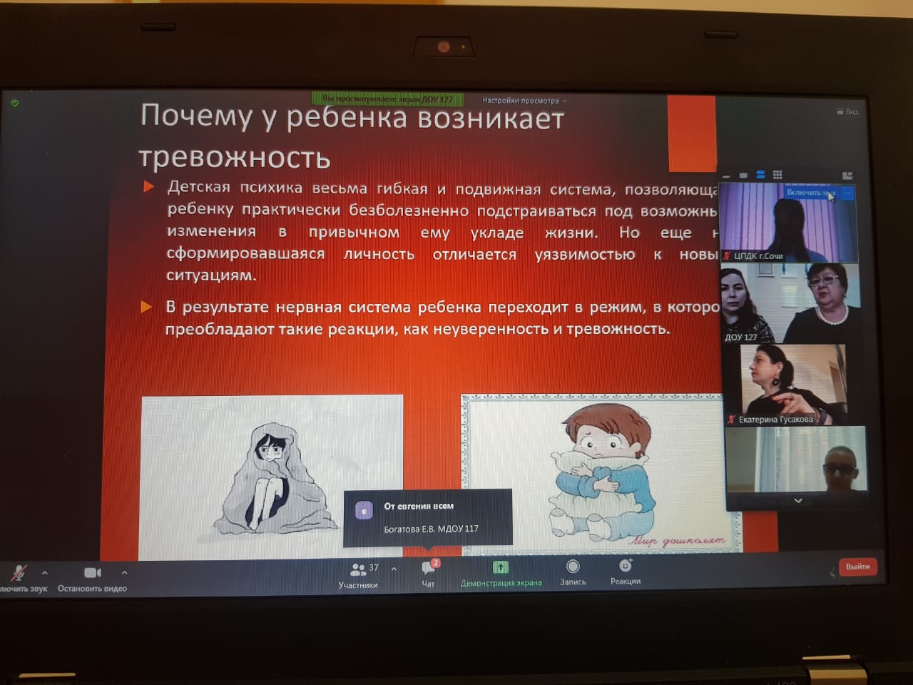 27 января 2021г. специалистами Сочинского филиала ГБУ КК «Центр диагностики и консультирования» в рамках «Школы мастеров» проведен мастер-класс для педагогов-психологов ДОО по теме «Комплексная поддержка дошкольников с повышенным уровнем тревожности» (онлайн, платформа Zoom).